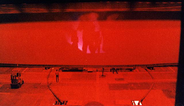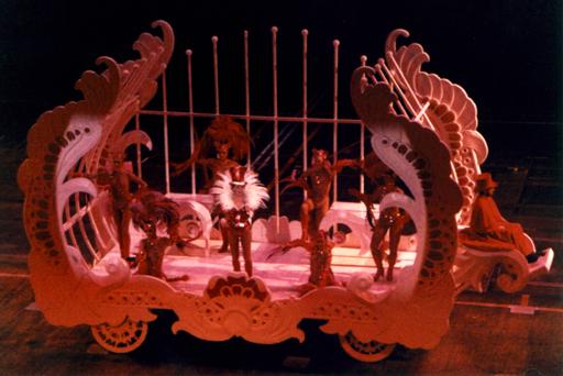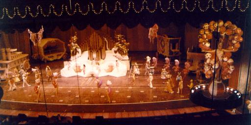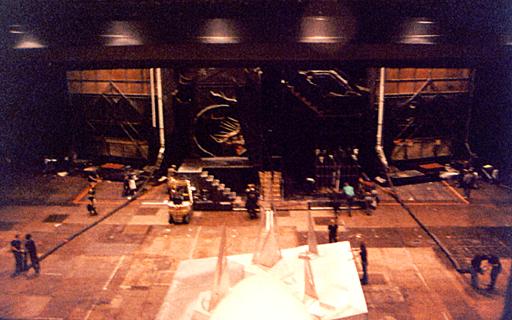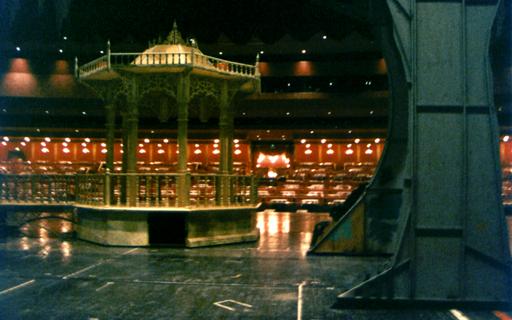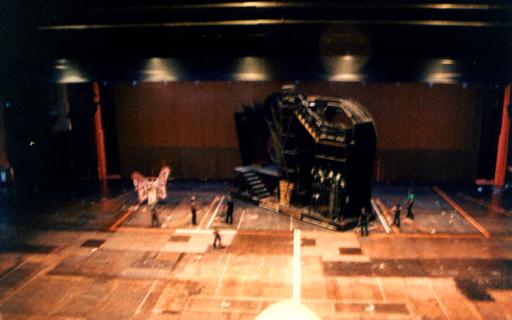 | The first call I ever got was to fill in for a week in the 'Lower Ziegfeld'. The 'Lower Ziegfeld' turned out to be a well-lit concrete area as big as the largest stage I had ever seen - it was just directly under the _real_ stage! Crammed into every spare corner were all kinds of pieces of huge, rolling stage equipment - from wagons to Space Rakes. Our responsibility was to load the equipment onto one of three elevators. The biggest elevator was a three-piece unit consisting of three interlocking 10'x30' units capable of something like 45' of vertical travel - it was like working in the bowels of an aircraft carrier!For the entire week - two shows per night, for seven nights, I worked in a well-lit environment, with the dull rumble of a show going on over my head. (For anyone familiar with 'traditional' theatre, you will understand my confusion.) I found it all rather bewildering, but the 'regulars' were incredibly helpful, and understanding. (For the first week, I worked mostly on one of two SMALLER elevators - 10' diameter "'vators" on Stage Left & Right.) |